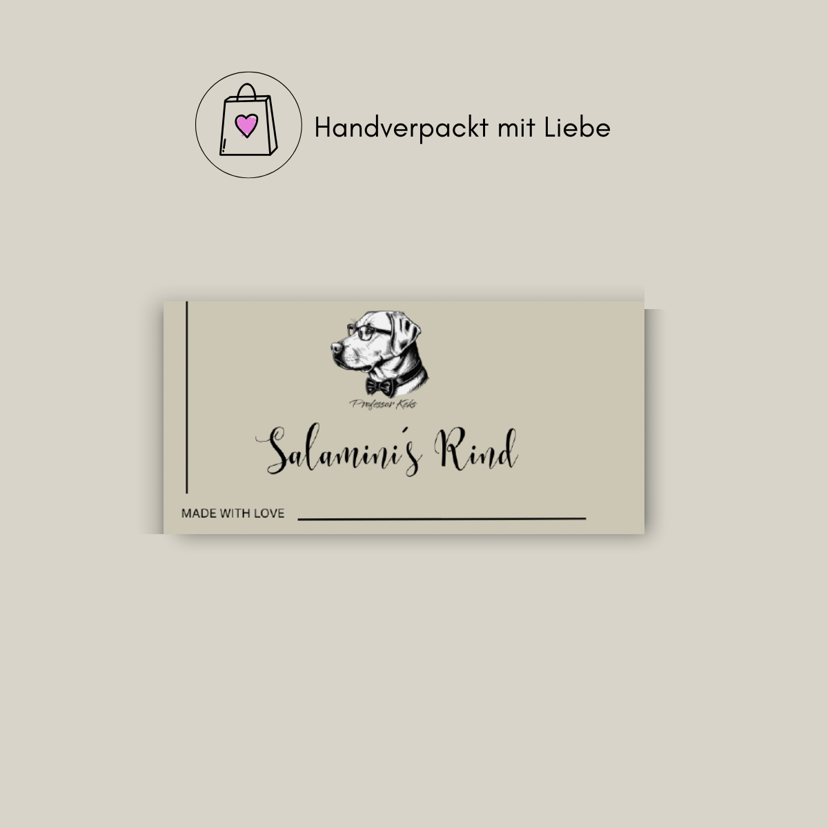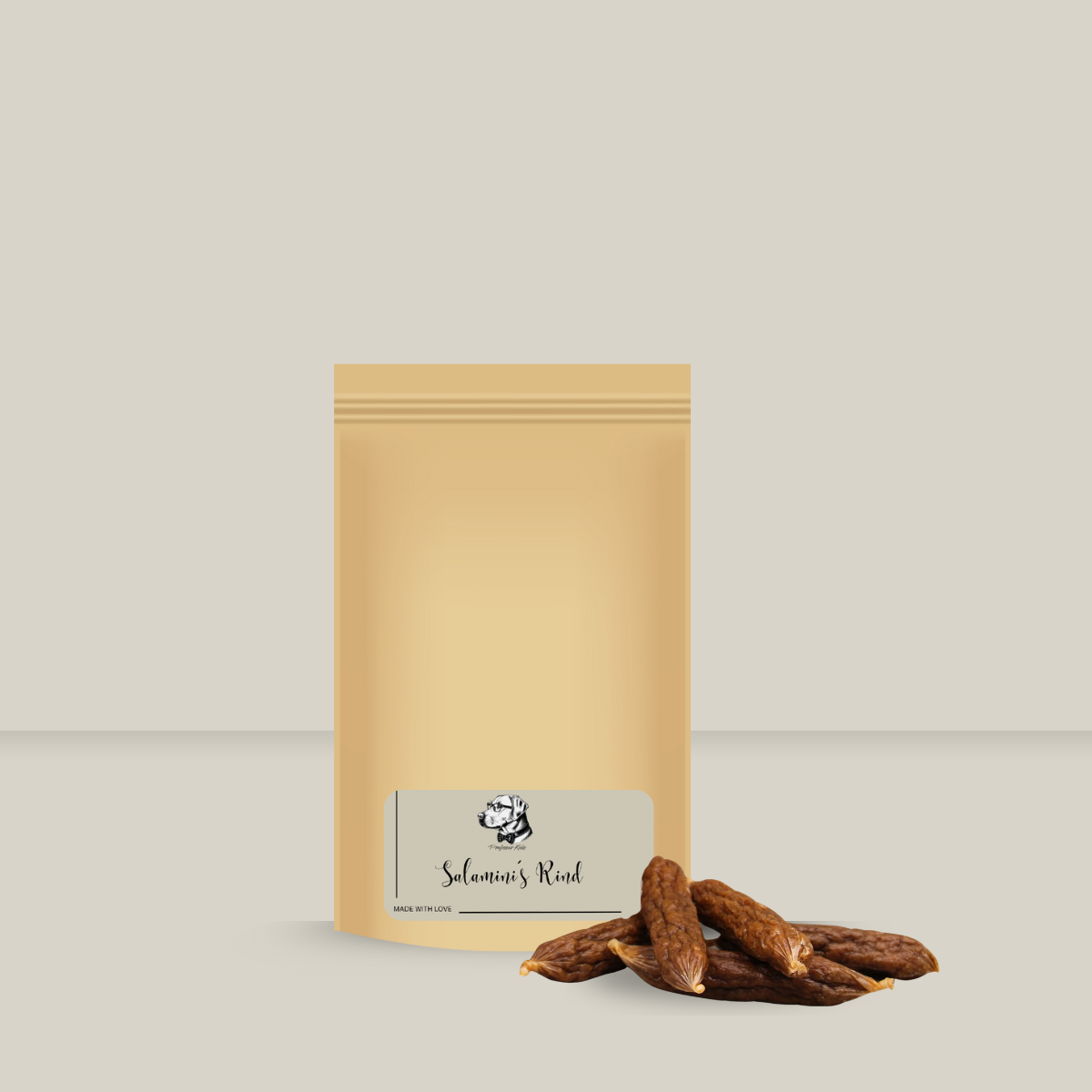 Unsere Rinder-Salaminis sind der perfekte Snack für kleine und große Fleischliebhaber! Hergestellt aus 68 % hochwertigem Rindfleisch, ergänzt mit etwas Huhn und schonend luftgetrocknet, überzeugen die Mini-Würstchen mit einem intensiv aromatischen Geschmack, den Hunde lieben.